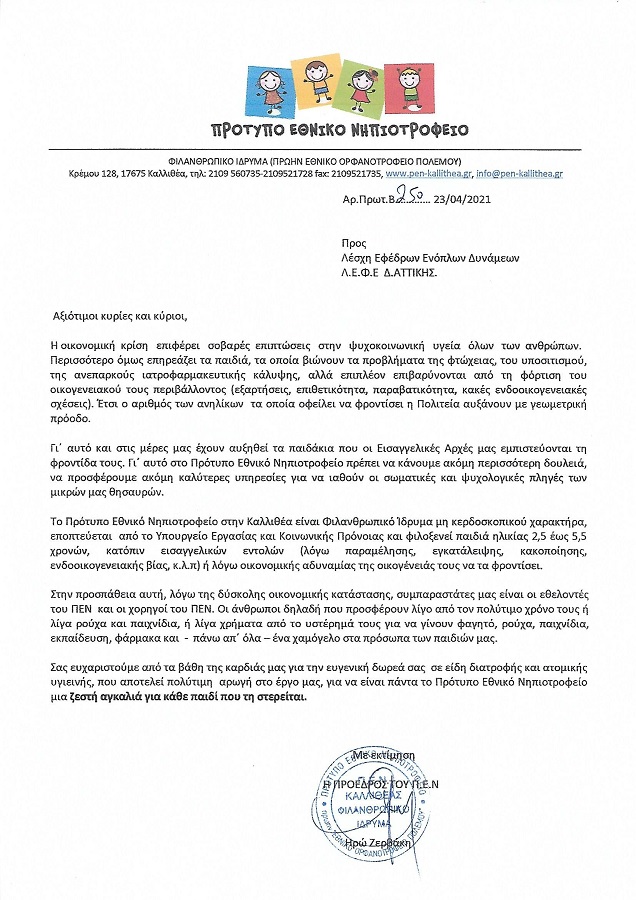 Αντιπροσωπεία της ΛΕΦΕΔ Αττικής επισκέφθηκε την Πέμπτη 22 Απριλίου 2021 το Πρότυπο Εθνικό Νηπιοτροφείο Καλλιθέας Αττικής όπου και παρέδωσε τρόφιμα για τα παιδιά που φιλοξενούνται στις εγκαταστάσεις του.