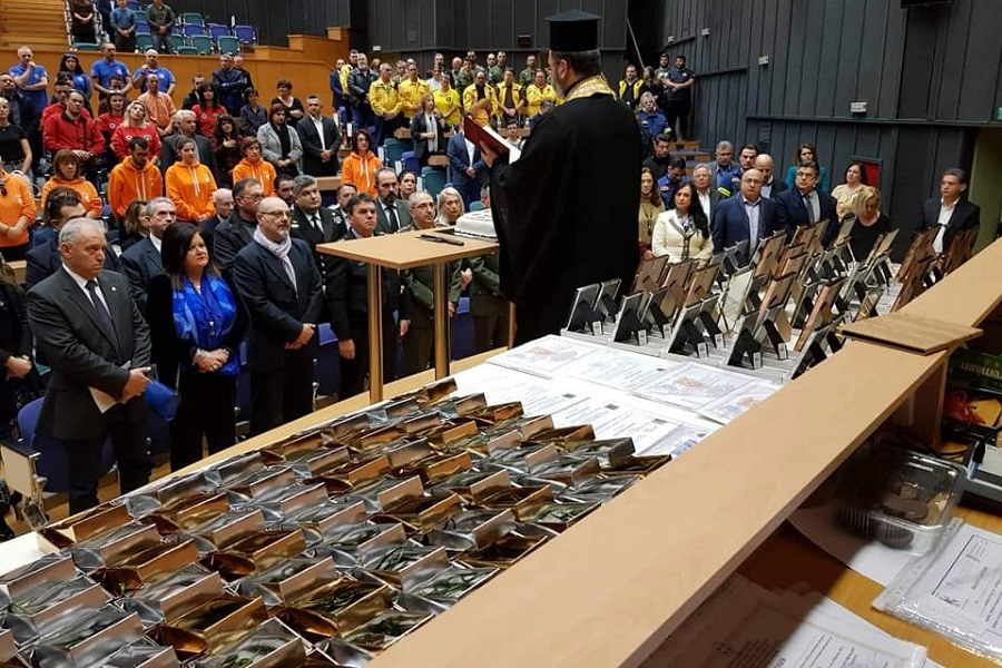 Στην κοπή πίτας οι εκπρόσωποι στρατιωτικής και πολιτικής ηγεσίας, τιμήθηκαν για την συμμετοχή και συμβολή τους καθώς και για την άριστη συνεργασία τους στις Δράσεις και Εκπαιδεύσεις του ΙΔΑΦΚ για τον πρώτο χρόνο λειτουργίας του, ενώ 42 Επικεφαλής και εκπρόσωποι Εθελοντικών Οργανώσεων από όλη την Ελλάδα, τιμήθηκαν με αναμνηστικό και παρέλαβαν τα πιστοποιητικά και τις βεβαιώσεις συμμετοχής των δράσεων, σε θέματα πρόληψης και ενημέρωσης, ετοιμότητας και εκπαίδευσης στην Διαχείριση Κρίσεων, από τους εκπροσώπους της ηγεσίας για το Συνέδριο «ΕΓΚΕΛΑΔΟΣ 2019», την Άσκηση ΠΥ Κορωπίου «ΕΓΚΕΛΑΔΟΣ 2019», των Βεβαιώσεων Πιστοποίησης Επιτυχόντων του Σχολείου Εκπαίδευσης Υγρού Στοιχείου Επιβίωσης Έρευνας Διάσωσης – Πάτρας & Γλυφάδας 2019, των ασκήσεων «ΉΦΑΙΣΤΟΣ 2019» στο Γηροκομείο Αθηνών και στα σχολικά συγκροτήματα της Αττικής.