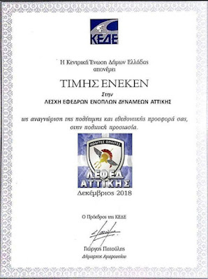 Η Κεντρική Ένωση Δήμων Ελλάδας απένειμε, τιμής ένεκεν, στην Λέσχη Εφέδρων Ενόπλων Δυνάμεων Αττικής, ως αναγνώριση της πολύτιμης και εθελοντικής προσφοράς της στην πολιτική προστασία.
